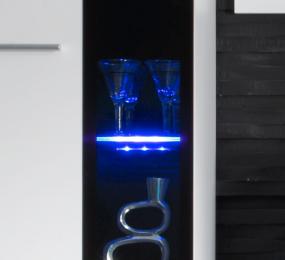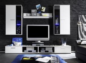 Die Wohnwand Salsa hebt sich durch eine moderne Frontgestaltung in zweifarbiger Optik hervor. Die weißen Fronten in mattem Dekor haben die Designer mit schwarzen Glaselementen und Möbelgriffen in Metall Optik ergänzt. Die Anbauwand wirkt damit jung und trendig. Zusätzlich können Sie mit der mitgelieferten LED Beleuchtung die Glaskanten in den Vitrinen effektiv beleuchten. Die Wohnwand Salsa steht für viel Stauraum und eine ansprechend umrahmte Präsentation von Liebhaberstücken.